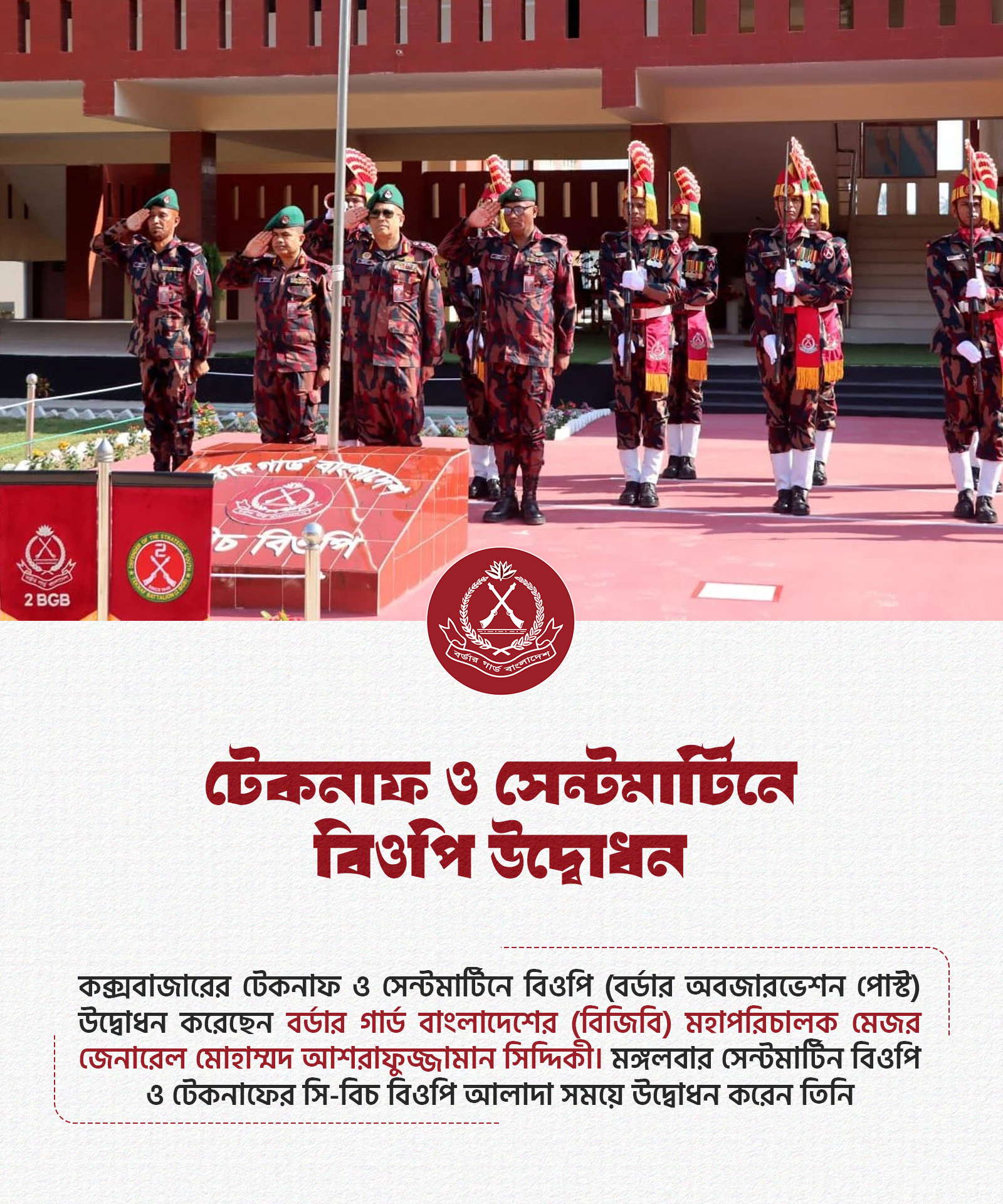 সীমান্ত ও উপকূলীয় নিরাপত্তা জোরদারের লক্ষ্যে টেকনাফে সেন্টমার্টিন বিওপি এবং লেঙ্গুরবিল সি-বিচ বিওপি উদ্বোধন করেছেন বিজিবি মহাপরিচালক মেজর জেনারেল মোহাম্মদ আশরাফুজ্জামান সিদ্দিকী